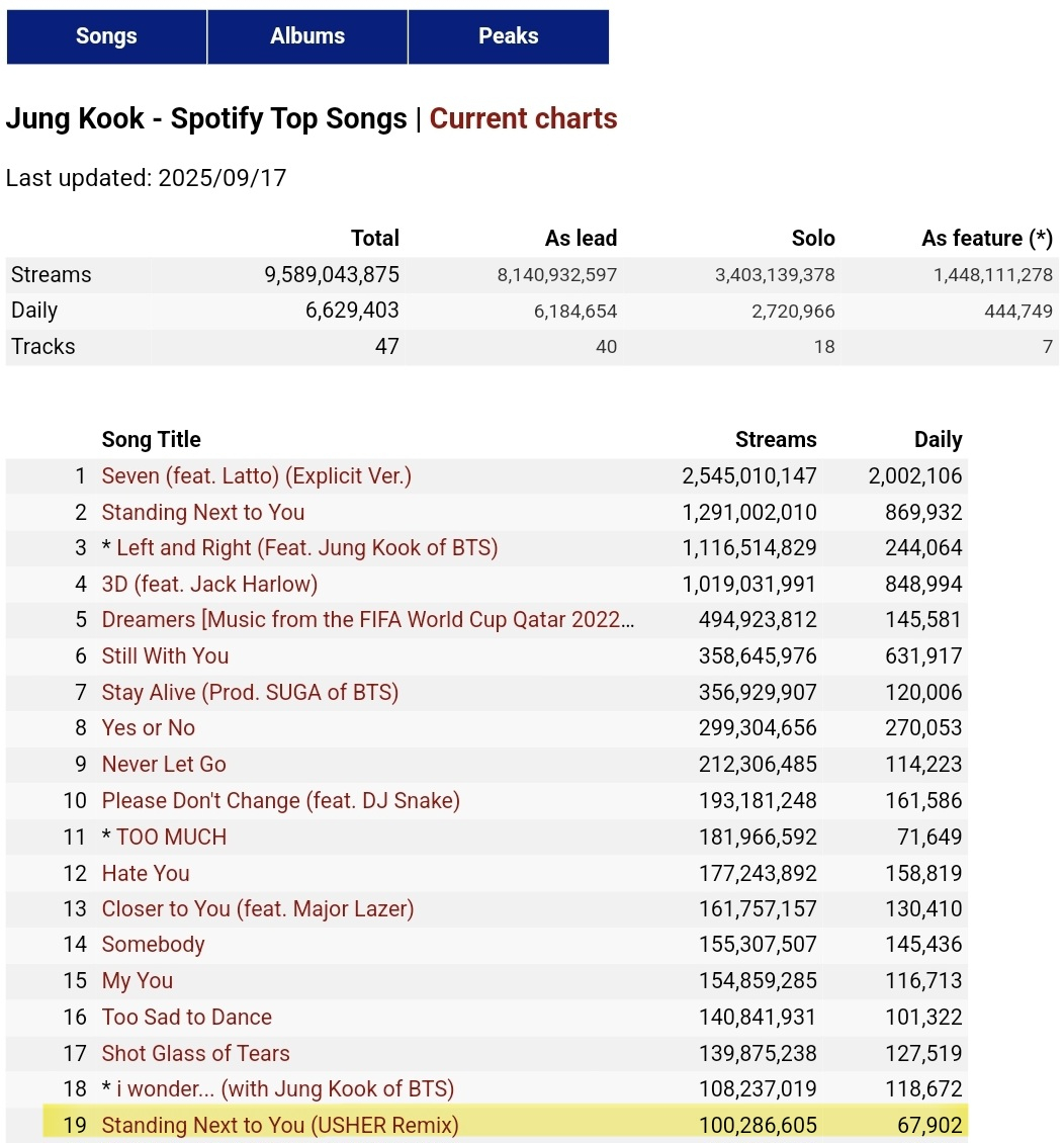정국이 어셔(Usher)와 협업한 'Standing Next to You-Usher Remix'(스탠딩 넥스트 투 유-어셔 리믹스) 버전은 최근 세계 최대 음원 스트리밍 플랫폼 스포티파이에서 1억 스트리밍을 돌파했다.