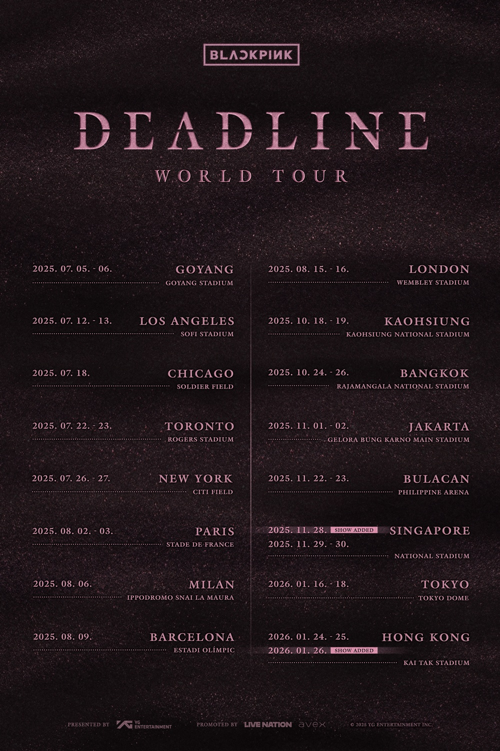 YG엔터테인먼트는 19일 블랙핑크 공식 SNS에 'BLACKPINK WORLD TOUR <DEADLINE>' 포스터를 게재했다. 이에 따르면 블랙핑크는 오는 11월 28일 싱가포르, 내년 1월 26일 홍콩 공연을 추가 개최하며 두 지역에서 총 6회에 걸쳐 현지 팬들과 만난다.