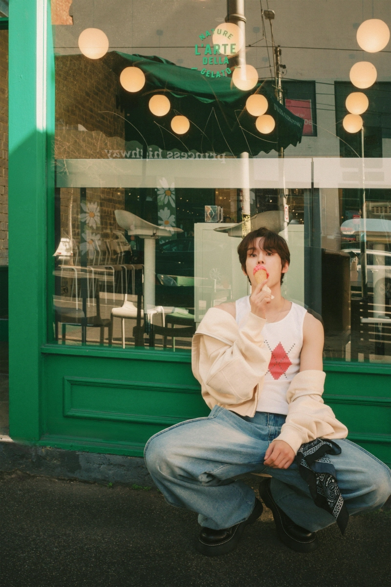두 번째 콘셉트 포토에서는 힙하고 자유분방한 무드가 돋보였다. 낡은 건물 외벽의 그래피티와 벽보가 가득한 골목길을 배경으로, 윤서빈은 한층 시크하고 개성 있는 모습을 연출했다. 흰색 티셔츠와 루즈핏 셔츠, 그리고 와이드 팬츠를 매치한 스타일링은 그의 트렌디한 감각을 드러내며, 무심한 듯하면서도 강렬한 눈빛과 포즈는 팬들의 마음을 사로잡았다.