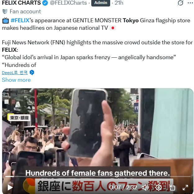 필릭스의 젠틀몬스터 도쿄 긴자 플래그십 스토어 방문은 일본의 주요 방송 네트워크인 후지 뉴스 네트워크(FNN)를 통해 전국에 보도되었다. FNN은 후지 텔레비전이 운영하는 일본 3대 방송 네트워크 중 하나로, 전국 28개 계열사를 통해 뉴스를 송출하는 주요 언론사다. FNN은 매장 밖에 모인 인파를 조명하며 다음과 같이 보도했다: