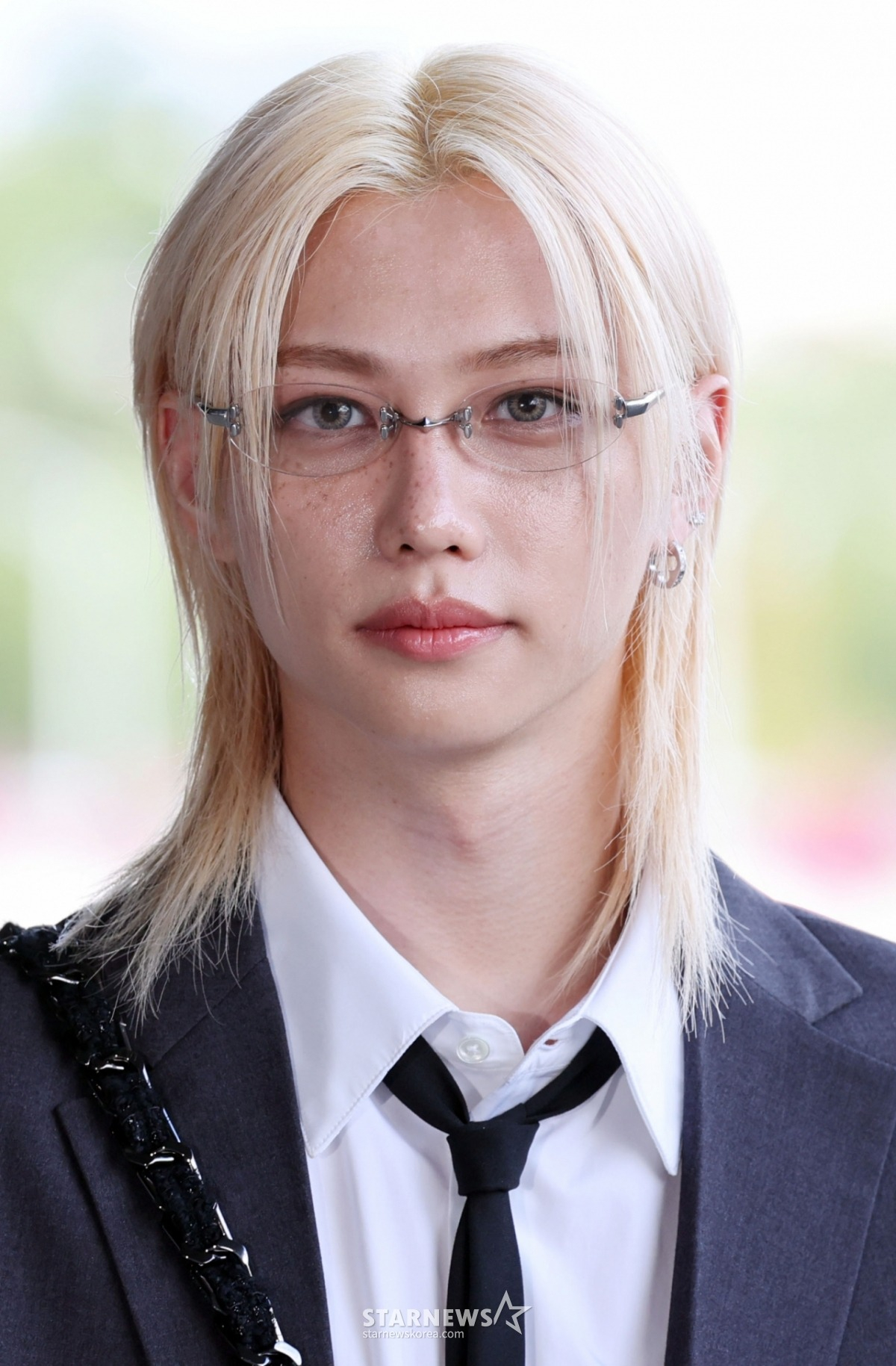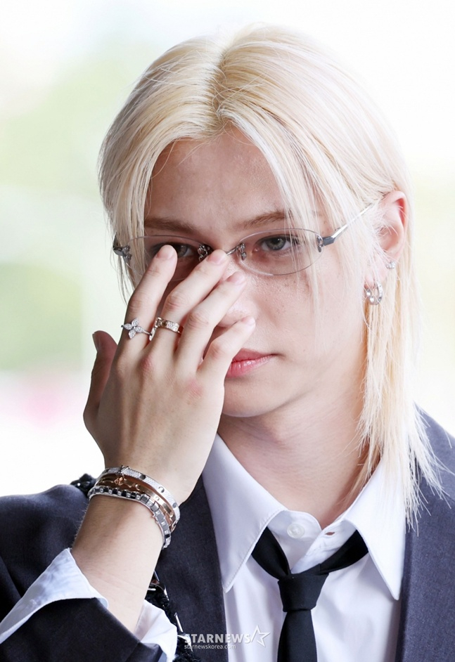 이날 필릭스는 긴 검은 코트에 매칭되는 베스트와 검은 하의로 시크한 룩을 연출했다. 액세서리로는 귀걸이와 스터드 피어싱, 그리고 젠틀몬스터의 무테 안경을 착용해 브랜드 앰버서더로서의 완벽한 모습을 선보였다.