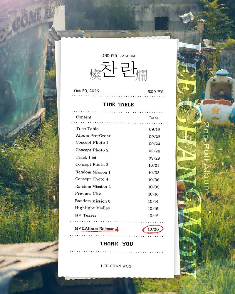 이찬원은 9월 19일 공식 소셜 미디어를 통해 정규 2집 앨범 '찬란(燦爛)' 예약 판매 일정과 타임 테이블을 공개했다.