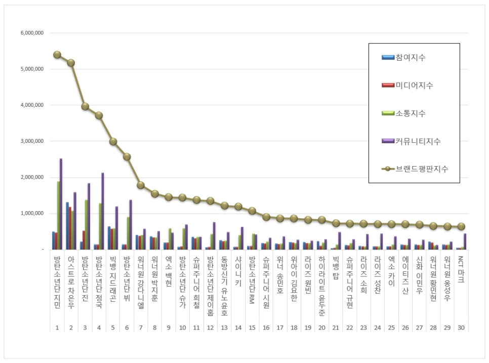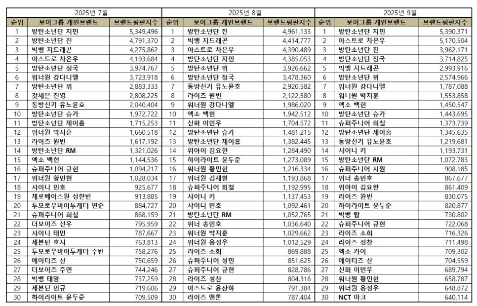 2025년 9월 보이그룹 개인 브랜드평판 30위 순위는 방탄소년단 지민, 아스트로 차은우, 방탄소년단 진, 방탄소년단 정국, 빅뱅 지드래곤, 방탄소년단 뷔, 워너원 강다니엘, 워너원 박지훈, 엑소 백현, 방탄소년단 슈가, 슈퍼주니어 희철, 방탄소년단 제이홉, 동방신기 유노윤호, 샤이니 키, 방탄소년단 RM, 슈퍼주니어 시원, 위너 송민호, 위아이 김요한, 라이즈 원빈, 하이라이트 윤두준, 빅뱅 탑, 슈퍼주니어 규현, 라이즈 소희, 라이즈 성찬, 엑소 카이, 에이티즈 산, 신화 이민우, 워너원 황민현, 워너원 옹성우, NCT 마크 순으로 분석됐다.