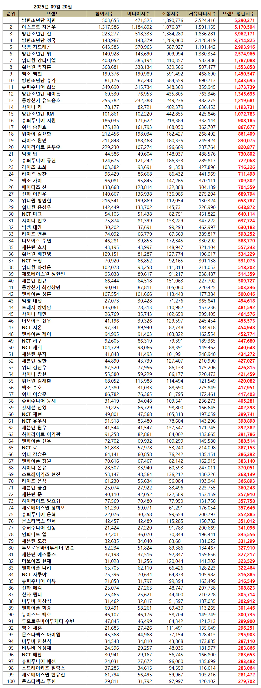 2025년 9월 보이그룹 개인 브랜드평판 100위 브랜드는 방탄소년단 지민, 아스트로 차은우, 방탄소년단 진, 방탄소년단 정국, 빅뱅 지드래곤, 방탄소년단 뷔, 워너원 강다니엘, 워너원 박지훈, 엑소 백현, 방탄소년단 슈가, 슈퍼주니어 희철, 방탄소년단 제이홉, 동방신기 유노윤호, 샤이니 키, 방탄소년단 RM, 슈퍼주니어 시원, 위너 송민호, 위아이 김요한, 라이즈 원빈, 하이라이트 윤두준, 빅뱅 탑, 슈퍼주니어 규현, 라이즈 소희, 라이즈 성찬, 엑소 카이, 에이티즈 산, 신화 이민우, 워너원 황민현, 워너원 옹성우, NCT 마크, 샤이니 민호, 빅뱅 태양, 라이즈 앤톤, 더보이즈 주연, 세븐틴 호시, 워너원 배진영, NCT 도영, 워너원 하성운, 제로베이스원 성한빈, 세븐틴 민규, 동방신기 최강창민, 엔하이픈 성훈, 빅뱅 대성, 트레저 방예담, 샤이니 태민, 더보이즈 선우, NCT 시온, 엔하이픈 제이, NCT 리쿠, NCT 재희, 세븐틴 우지, 세븐틴 정한, 위너 김진우, 샤이니 종현, 워너원 김재환, 엑소 수호, 위너 이승훈, 슈퍼주니어 동해, 갓세븐 진영, NCT 재현, NCT 유우시, 세븐틴 원우, 하이라이트 이기광, 엔하이픈 선우, NCT 료, 위너 강승윤, 엔하이픈 정원, 샤이니 온유, 스트레이키즈 현진, 라이즈 은석, 세븐틴 승관, 세븐틴 준, 하이라이트 양요섭, 제로베이스원 장하오, 슈퍼주니어 은혁, 몬스타엑스 민혁, 슈퍼주니어 신동, 인피니트 엘, 세븐틴 도겸, 투모로우바이투게더 연준, 세븐틴 에스쿱스, 더보이즈 현재, 엔하이픈 니키, NCT 사쿠야, 슈퍼주니어 이특, 신화 에릭, 신화 앤디, 비투비 이창섭, 엔하이픈 희승, 뉴이스트 백호, 투모로우바이투게더 수빈, 엑소 세훈, 몬스타엑스 아이엠, 비투비 임현식, 비투비 육성재, NCT 해찬, 슈퍼주니어 예성, 스트레이키즈 필릭스, 제로베이스원 한유진, 몬스타엑스 주헌이다.
