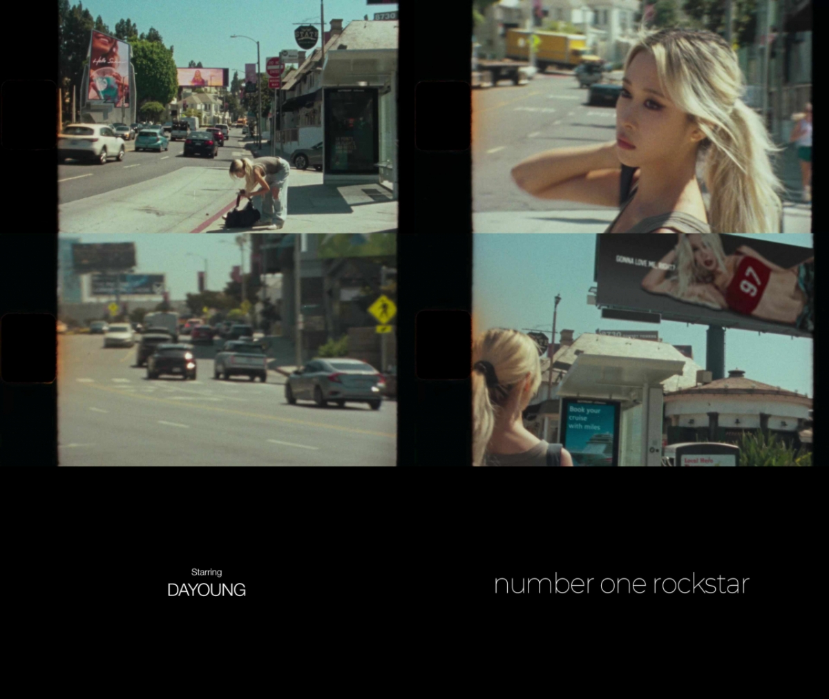 공개된 영상은 LA의 거리를 거니는 다영을 필름 카메라로 담는 듯한 연출로 시작된다. 다영은 전광판 속 또 다른 다영을 바라봤고, 이어 'Starring DAYOUNG' 이라는 문구가 떠 마치 다영이 주연인 영화의 예고편을 연상케 했다.