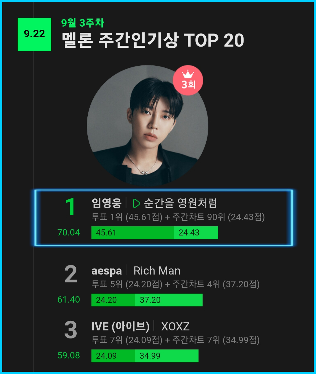 임영웅은 정규 2집 타이틀곡 '순간을 영원처럼'으로 9월 3주차 멜론 주간인기상 TOP20 1위를 차지했다.