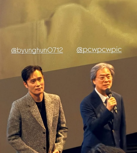 뷔는 23일 자신의 계정에 배우 이병헌과 박찬욱 감독이 무대인사하는 모습의 사진을 공개했다.