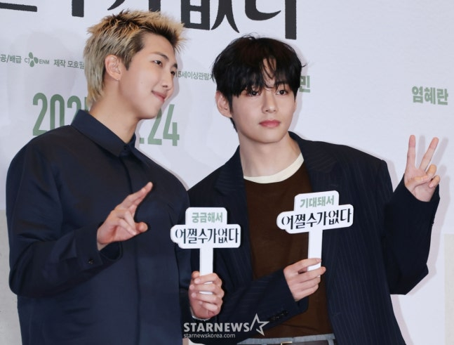 뷔는 지난 22일 서울 CGV용산아이파크몰에서 진행된 '어쩔수가 없다'(감독 박찬욱) VIP시사회에 멤버 RM과 함께 참석했다.