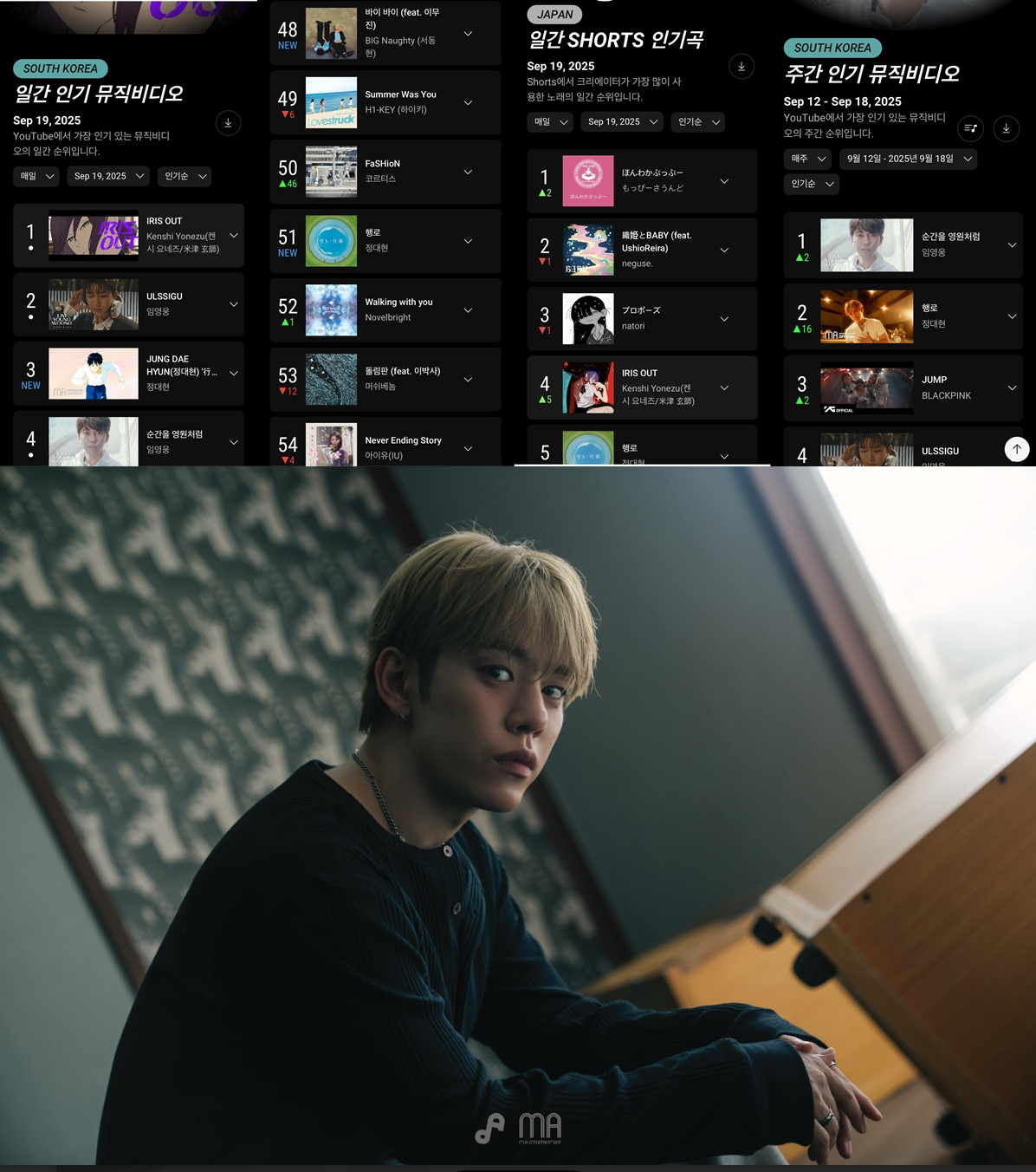 짧은 영상 콘텐츠에서도 정대현의 저력은 빛났다. 유튜브 '일간 쇼츠 인기곡' 차트에서 '행로'가 5위에 오르며, 숏폼 중심의 음악 소비 트렌드에서도 강한 존재감을 드러냈다. 특히 일본 국가 기준 쇼츠 차트에서도 5위를 기록, 일본어 버전의 감성적인 분위기와 영상미가 해외 팬층에도 폭넓게 어필하고 있음을 입증했다.
