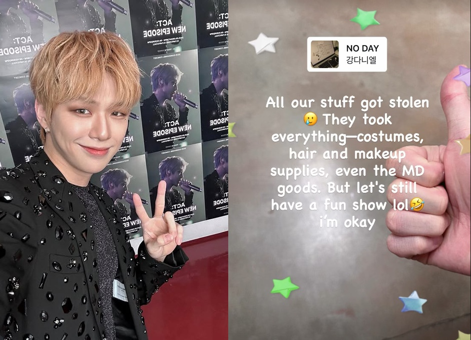 강다니엘은 23일 자신의 인스타그램을 통해 "우리 물건을 모두 도난당했다. 우리 의상과 헤어, 메이크업 도구 그리고 MD 굿즈도 가져갔다"라고 밝혔다. 이어 "하지만 재밌게 공연하자. 난 괜찮다"라고 현 상황을 밝혔다.