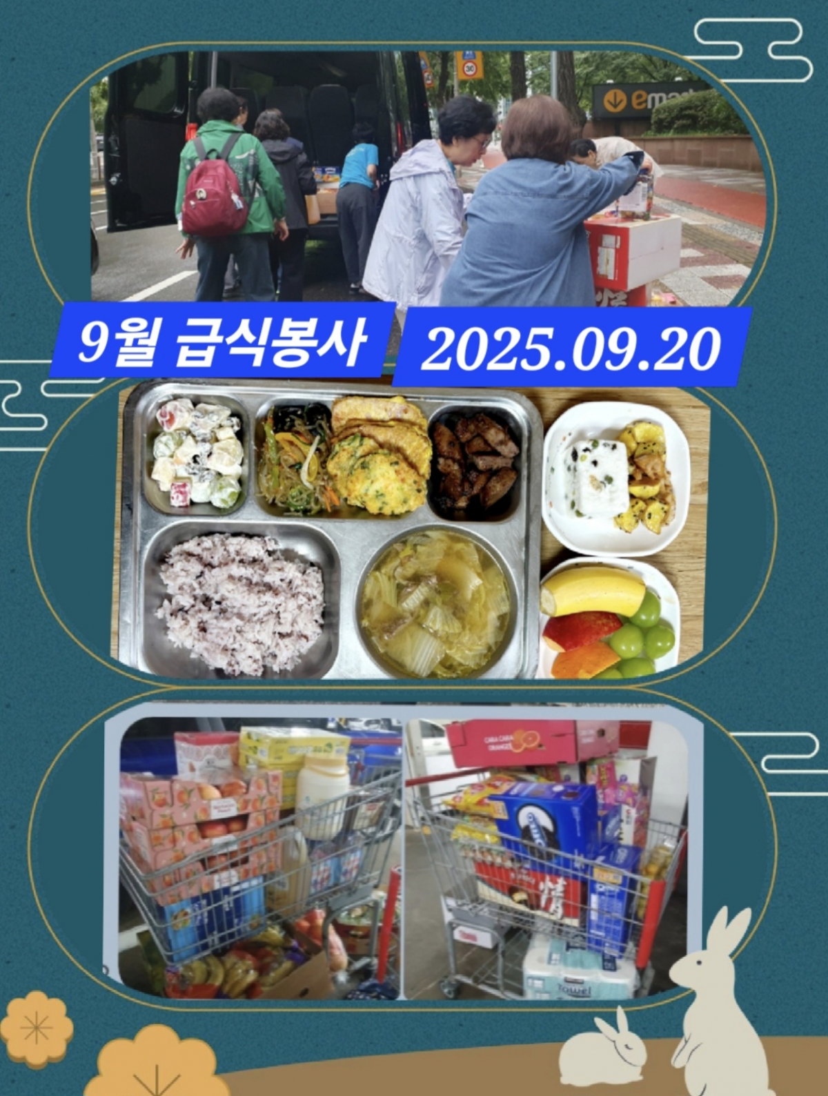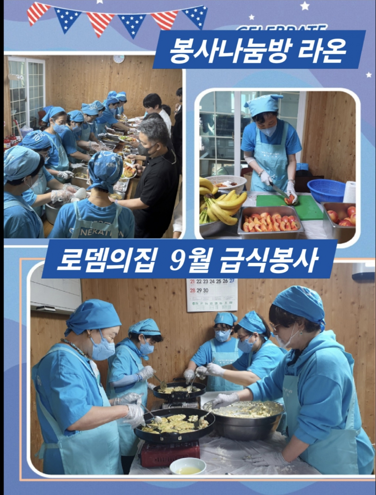 이달은 로뎀의집 작은음악회 축하 의미로 식단을 다양하게 구성했다. 숯불구이로 준비한 양념돼지갈비, 소고기 배추된장국, 잡채, 새우 야채전, 햄 전, 과일샐러드, 고구마 연근 맛탕, 축제 축하 기념 떡도 제공했다.