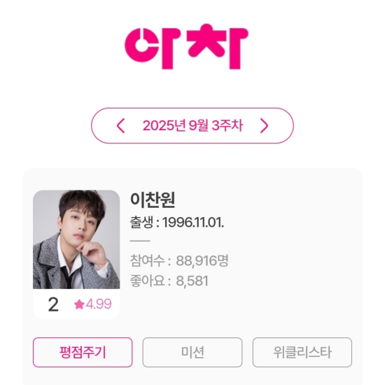 이찬원은 9월 3주 차 아이돌차트 평점랭킹에서 8만 8916표를 획득, 2위를 기록했다.