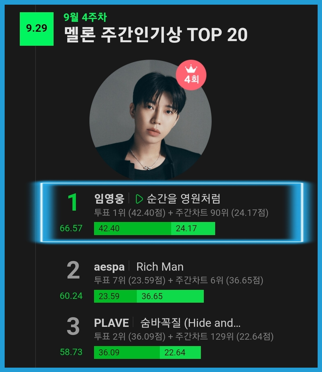 임영웅은 정규 2집 타이틀곡 '순간을 영원처럼'으로 9월 4주차 멜론 주간인기상 TOP20 1위를 차지했다.