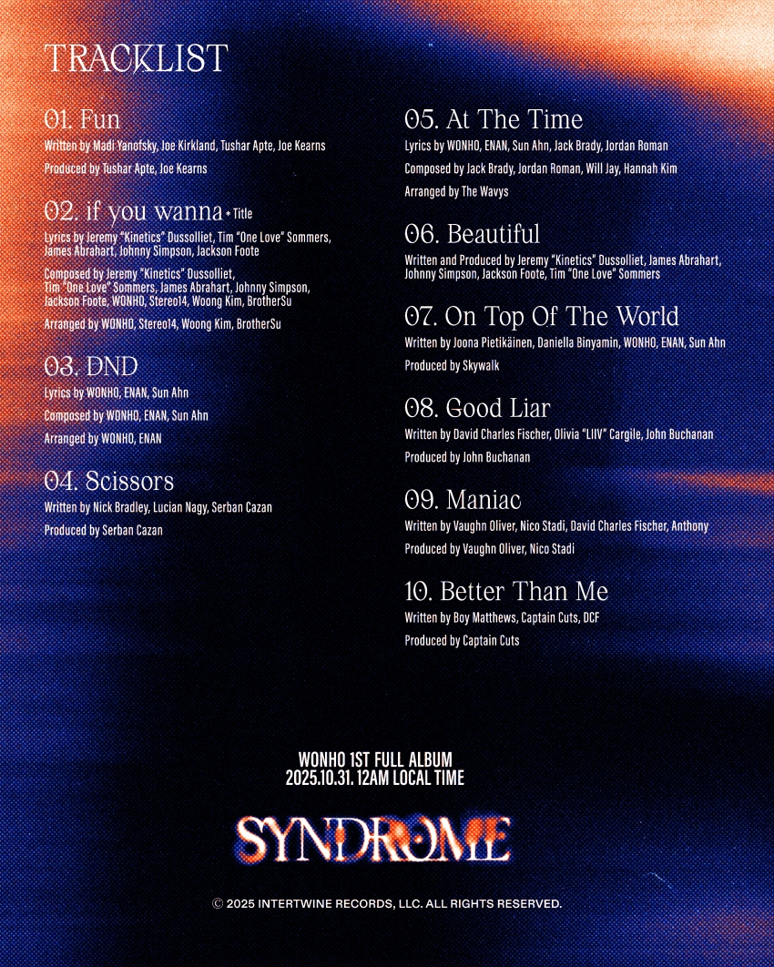 소속사 하이라인엔터테인먼트는 지난 1일 오후 8시 공식 SNS를 통해 원호의 첫 번째 정규 앨범 '신드롬(SYNDROME)' 트랙리스트를 공개했다.