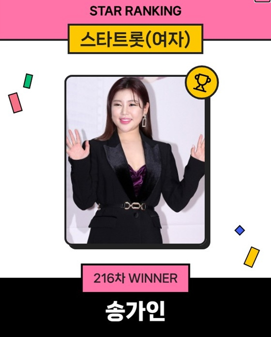 송가인은 지난 9월 25일 오후 3시 1분부터 10월 2일일 오후 3시까지 진행된 216차 스타랭킹 스타트롯 여자 랭킹 투표에서 4만6622표를 획득하며 1위에 올랐다.