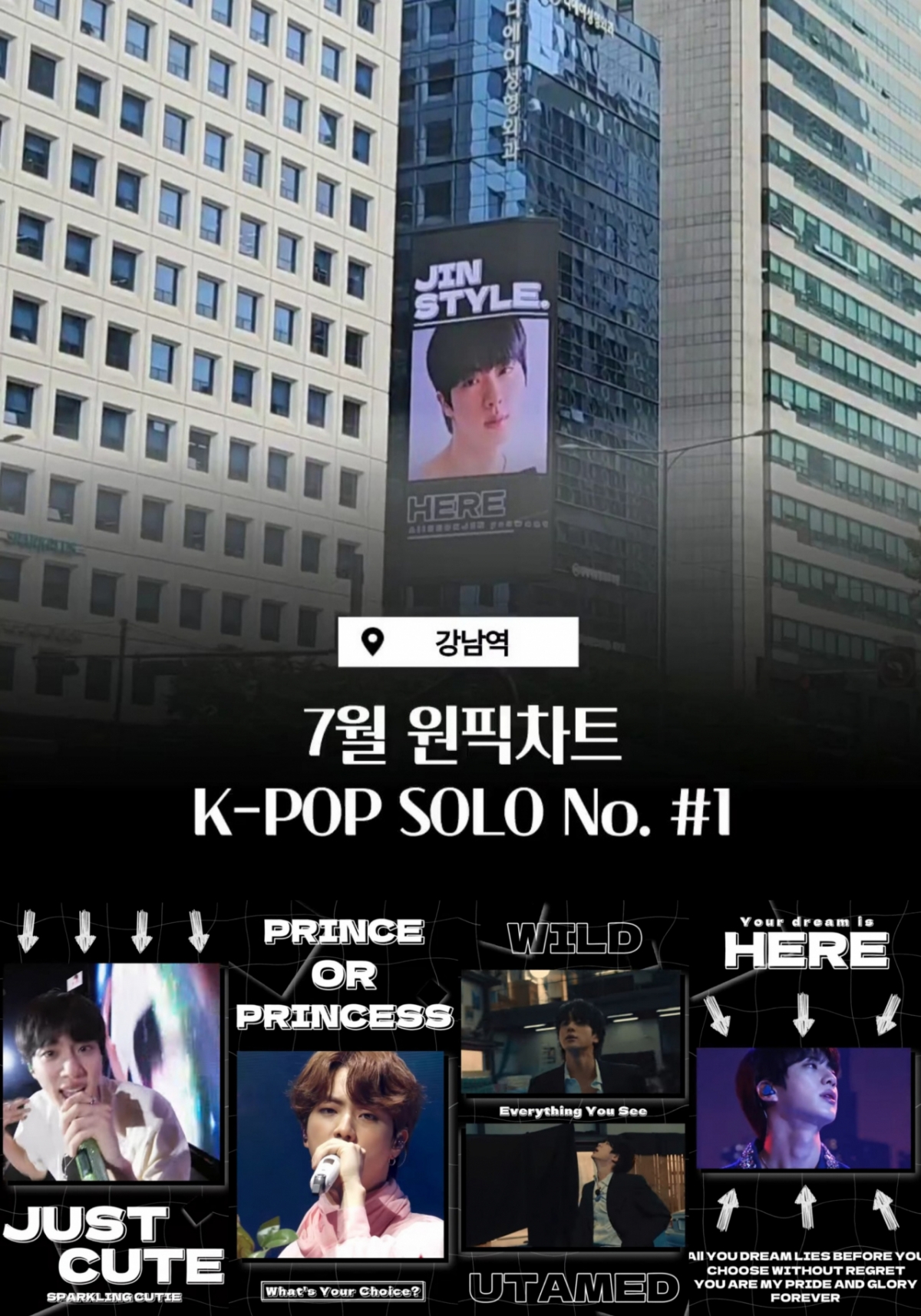 앞서 7월 '원픽차트 K-POP(Solo)'부문에서 1위를 차지한 진의 리워드 광고는 10월 2일부터 10월 6일까지 강남역 빌딩에서 만나볼 수 있다.