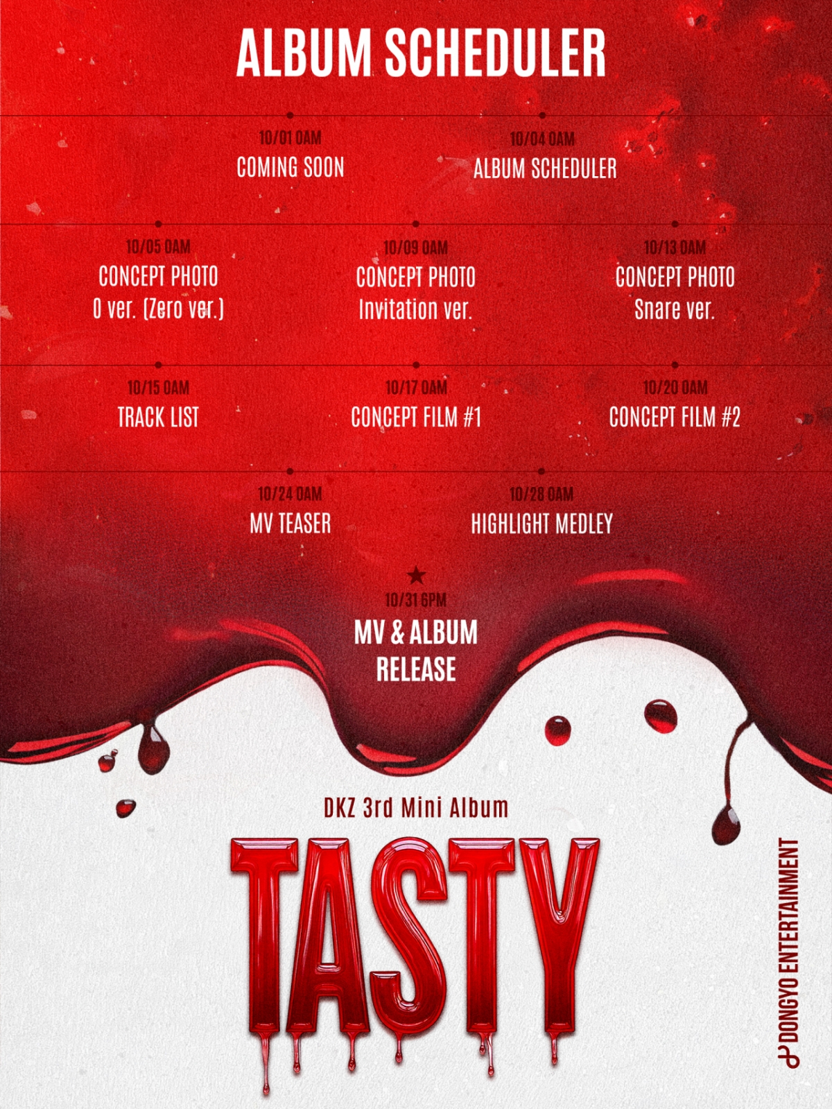 특히 DKZ는 Zero, Invitation, Snare 등 세 가지 버전의 콘셉트 포토를 순차 공개한다. 기존의 DKZ에게서 볼 수 없던 매력을 집약해 팬들에게 'TASTY'한 면모를 선사할 예정이다.
