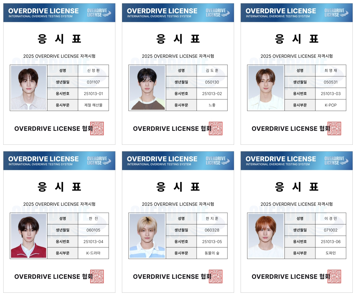 TWS는 이날 팀 SNS 채널에 '오버드라이브 라이선스' 스터디 모집글과 자격증 소개글을 게재하며 스터디의 시작을 알렸다. 이후 인스타그램 공식 계정의 공지 채널에 멤버들의 시험 응시표를 공개해 흥미를 더했다. 응시표에 6인 6색 개성이 담긴 응시 부문이 눈길을 끈다. 이들은 각자 제철 해산물(신유), 느좋(느낌 좋다는 의미의 신조어, 도훈), K-팝(영재), K-드라마(한진), 동물의 숲(지훈), 도파민(경민) 등 다양한 부문에 지원해 팬들에게 큰 웃음을 줬다.