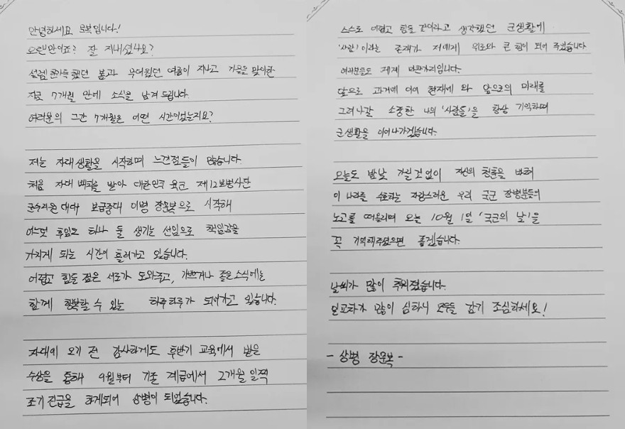 이어 "자대에 오기 전 감사하게도 후반기 교육에서 받은 수상을 통해 9월부터 기존 계급에서 2개월 일찍 조기진급을 하게 되어 상병이 되었습니다. 스스로 어렵고 힘들 것이라고 생각했던 군생활에 사람이라는 존재가 저에게 위로와 큰 힘이 되어주었습니다. 여러분들도 제게 마찬가지입니다"라며 "앞으로도 과거에 이어 현재에 와 앞으로의 미래를 그려나갈 소중한 나의 사람들을 항상 기억하며 군생활을 이어나가겠습니다"라고 다짐했다.