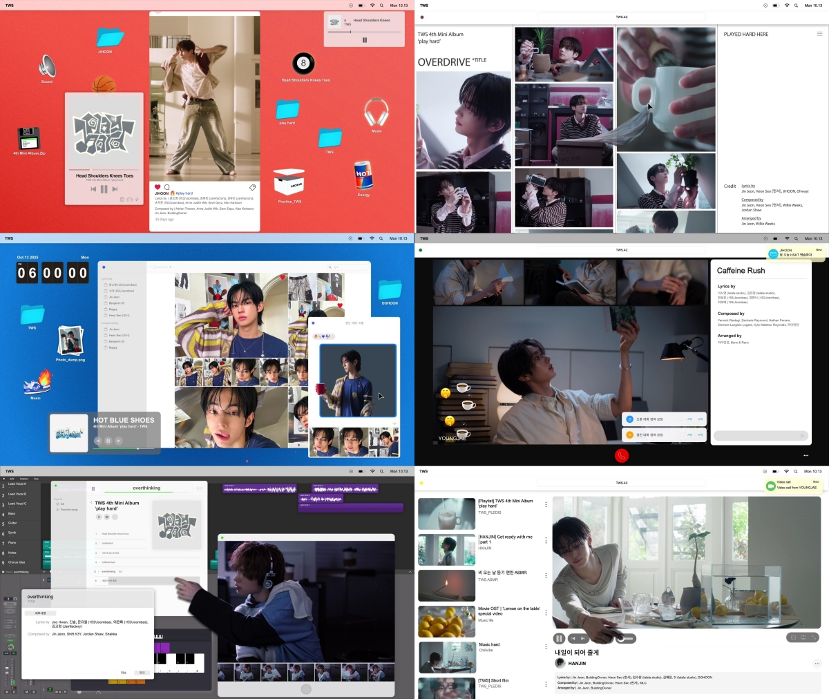 TWS(신유, 도훈, 영재, 한진, 지훈, 경민)는 8일 오후 10시 하이브 레이블즈 유튜브 채널에 미니 4집 'play hard'의 하이라이트 메들리 영상을 게재했다. 컴퓨터 화면을 본뜬 영상 속 여섯 멤버는 아이콘, 사진 폴더, 음악 재생창 등 다양한 인터페이스를 자유롭게 넘나들며 신보의 수록곡 일부를 들려준다.