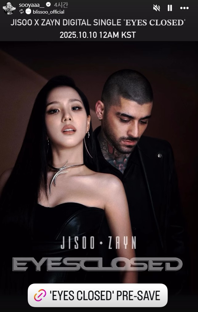 블랙핑크 지수가 전 원디렉션 멤버 제인 말리크와의 듀엣곡 'Eyes Closed'의 티저 비디오를 9일 공개했다. 아울러 한국시간 내일 오후1시 에 이노래를 발매한다고 공식 발표했다. 이번 협업은 지수에게 있어 첫 공식 남성 아티스트와의 콜라보레이션으로, 글로벌 음악 팬들의 이목을 집중시키고 있다.
