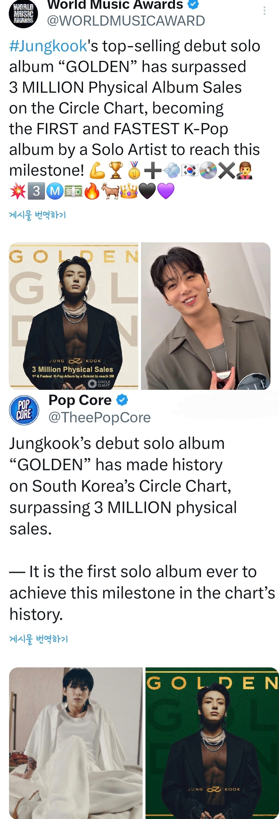 '유럽의 빌보드'라 불리는 '월드뮤직어워드'(WMA), 해외 음악 매체 '팝 코어'(Pop Core) 공식 계정에 따르면, 'GOLDEN'은 써클 앨범 차트 역사상 판매량 300만장을 달성한 최초의 솔로 앨범이라는 신기록을 세웠다.