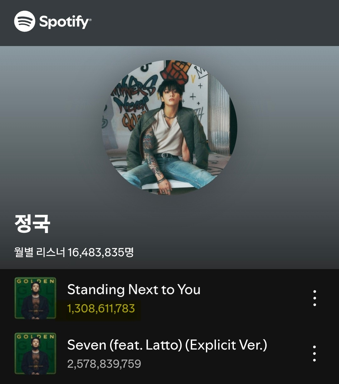 정국이 2023년 발매한 솔로곡 'Standing Next to You'는 최근 세계 최대 음원 스트리밍 플랫폼 스포티파이(Spotify)에서 13억 스트리밍을 넘어섰다.