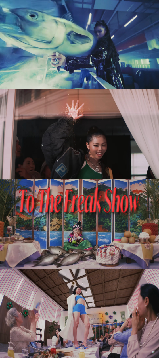 'Yes, you know I'm born 딴따라 / 응 염색체 차이다 종이 난 달라 / 네가 난 더 신기해 / 눈이 안 돌았어 왜 / 기분 날 것 같아 / 회 쳐 먹자 나랑 / Welcome to the Freak Show / 자, Throw the V pose / 잘난 검지를 접어 / 남은 건 너나 먹어' - 영빈 '프릭쇼' 중