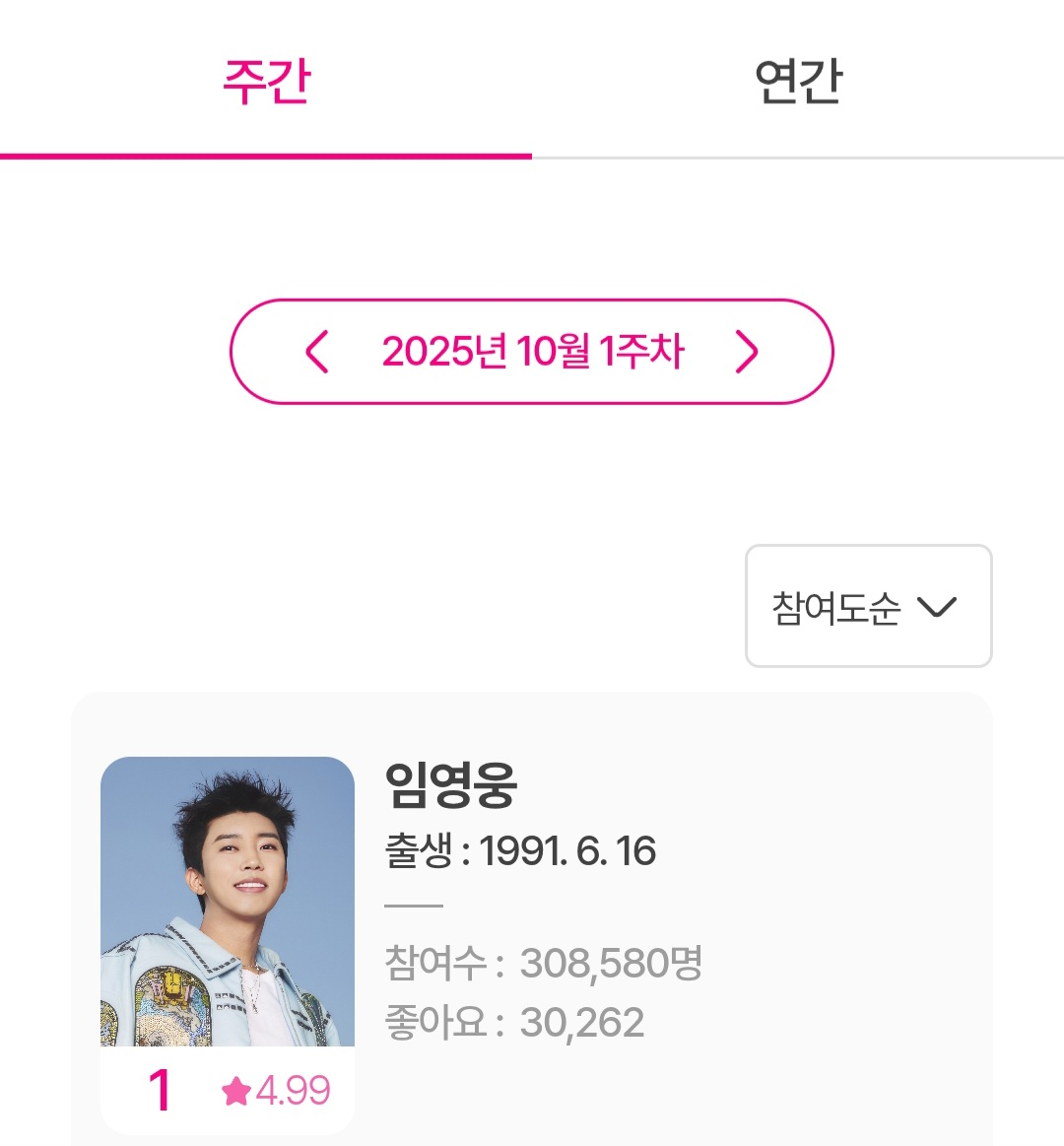임영웅은 10월 6일부터 10월 12일까지 집계된 10월 1주차 아이돌차트 평점랭킹에서 30만 8580표를 획득, 1위를 차지했다.