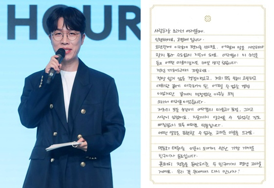 어떻게 말을 시작해야할지 몰라 수도 없이 지우게 돼요. 여러분이 이 소식을 듣고 어떤 마음이실지도 매일 생각했습니다. 걱정 끼쳐드려서 죄송해요.
