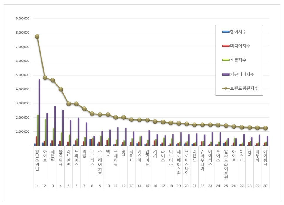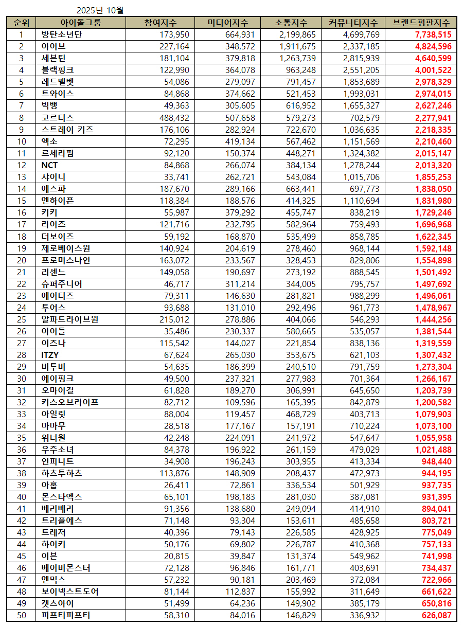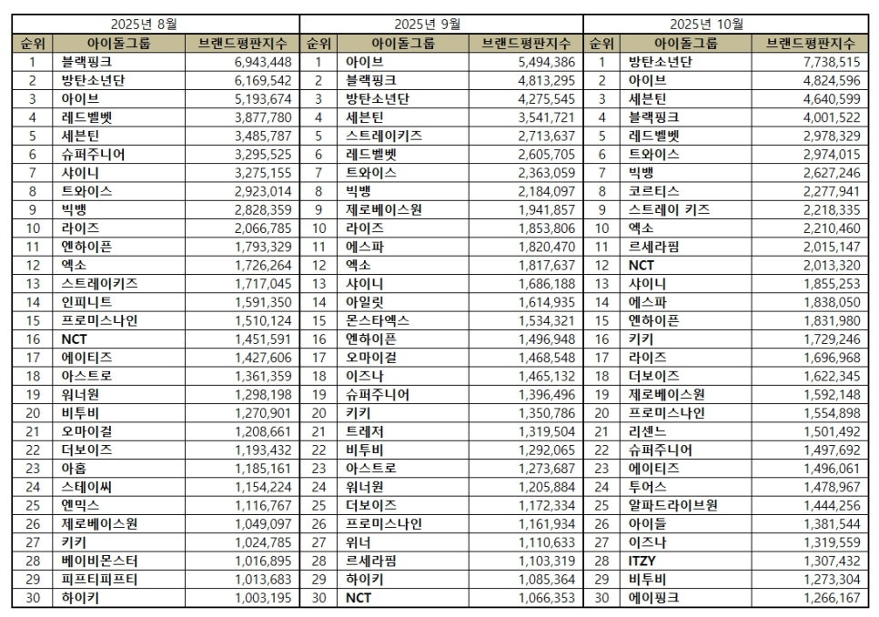 2025년 10월 아이돌그룹 브랜드평판 30위 순위는 방탄소년단, 아이브, 세븐틴, 블랙핑크, 레드벨벳, 트와이스, 빅뱅, 코르티스, 스트레이 키즈, 엑소, 르세라핌, NCT, 샤이니, 에스파, 엔하이픈, 키키, 라이즈, 더보이즈, 제로베이스원, 프로미스나인, 리센느, 슈퍼주니어, 에이티즈, 투어스, 알파드라이브원, 아이들, 이즈나, ITZY, 비투비, 에이핑크 순으로 분석됐다.