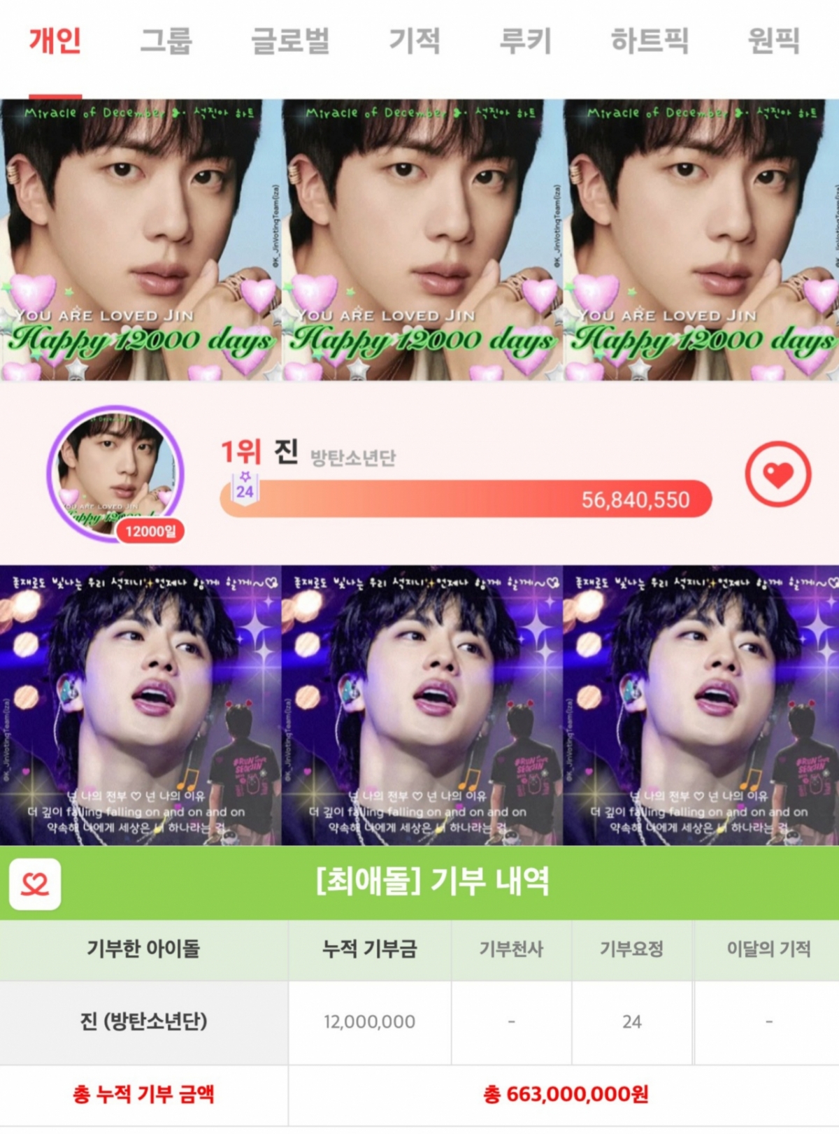 진은 10월 11일 '탄생 11200일'을 맞아 글로벌 팬들의 뜨거운 사랑과 응원 속에 5684만 550개의 하트를 얻으며 남자 개인 순위 1위에 등극, 동시에 제813대 기부 요정으로 선정됐다.