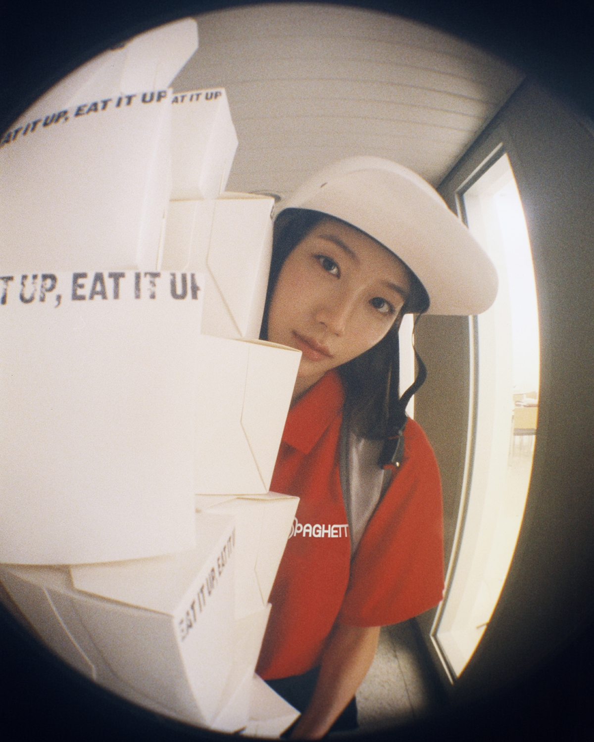 사진 역시 필름 카메라의 빈티지한 색감을 활용해 감성을 극대화한다. 김채원은 시원한 바람을 만끽하며 배달에 나선다. 바람에 흩날리는 머리카락과 아련한 눈빛이 청초함을 자아낸다. 사쿠라는 팀 공식 로고와 'EAT IT UP' 문구가 적힌 박스 사이에서 메뉴판을 입에 물고 있다. 허윤진은 배달지 앞에서 금방이라도 문을 두드릴 듯한 자세를 취하고 있다. 카즈하의 사진은 문 너머의 렌즈로 바라보는 듯한 연출로 신선함을 준다. 홍은채는 다리 아래에서 스파게티 박스를 들고 또렷한 이목구비를 자랑한다.