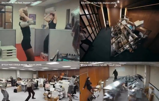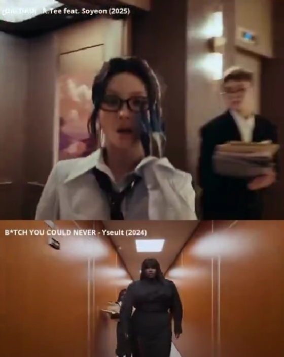 지난해 발매된 이졸트의 'B**** YOU COULD NEVER'와 지난 8월 발매된 알티의 '담다디' 두 뮤직비디오를 비교해보면, 복도를 걸어 나오는 장면과 책장을 넘어트리는 장면 등 곳곳에 비슷한 장면이 등장했다. '담다디'는 알티와 그룹 아이들 소연이 함께 작업한 곡이다.