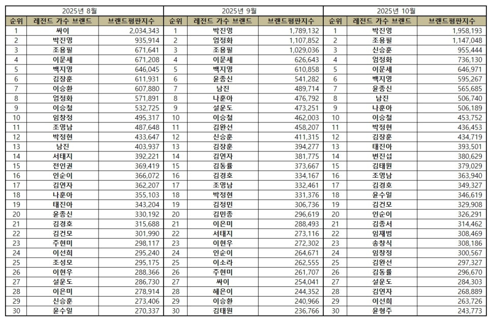 2025년 10월 레전드 가수 브랜드평판 30위 순위는 박진영, 조용필, 신승훈, 엄정화, 이문세, 백지영, 윤종신, 남진, 나훈아, 이승철, 박정현, 김장훈, 태진아, 변진섭, 김태원, 조영남, 김경호, 윤수일, 김건모, 인순이, 김종서, 임재범, 송창식, 임창정, 김완선, 김동률, 설운도, 김연자, 이선희, 윤형주 순으로 분석됐다.