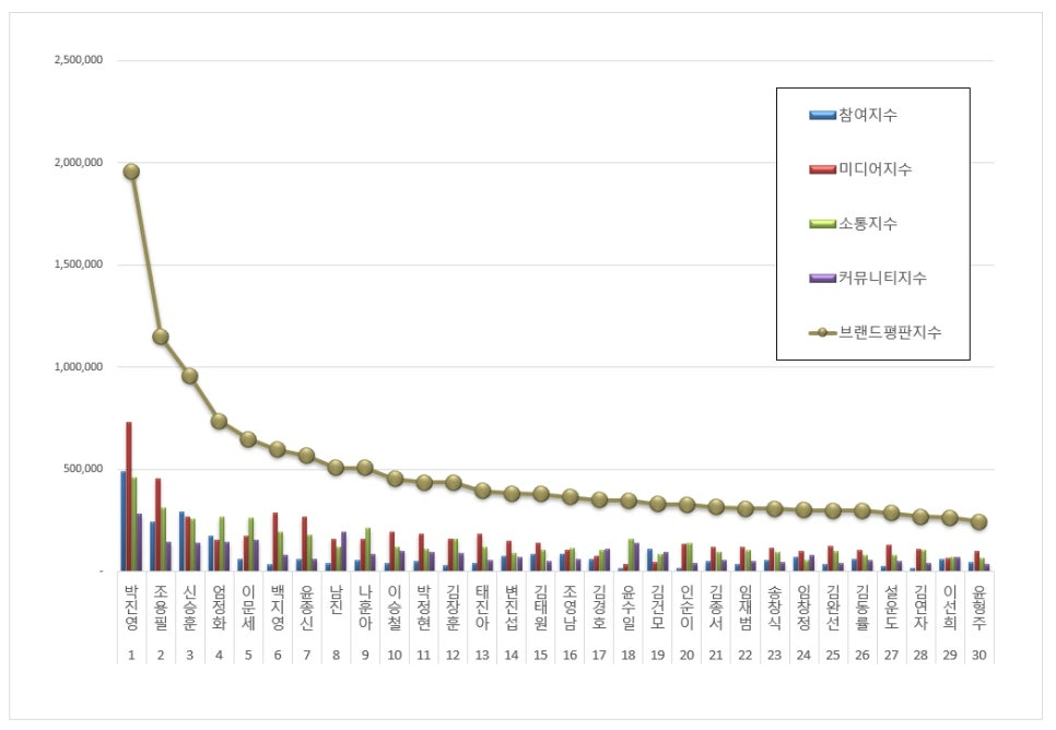 3위, 신승훈 브랜드는 참여지수 291,878 미디어지수 268,755 소통지수 255,522 커뮤니티지수 139,288이 되면서 브랜드평판지수 955,444로 분석됐다. 지난 9월 브랜드평판지수 411,315와 비교해보면 132.29% 상승했다.