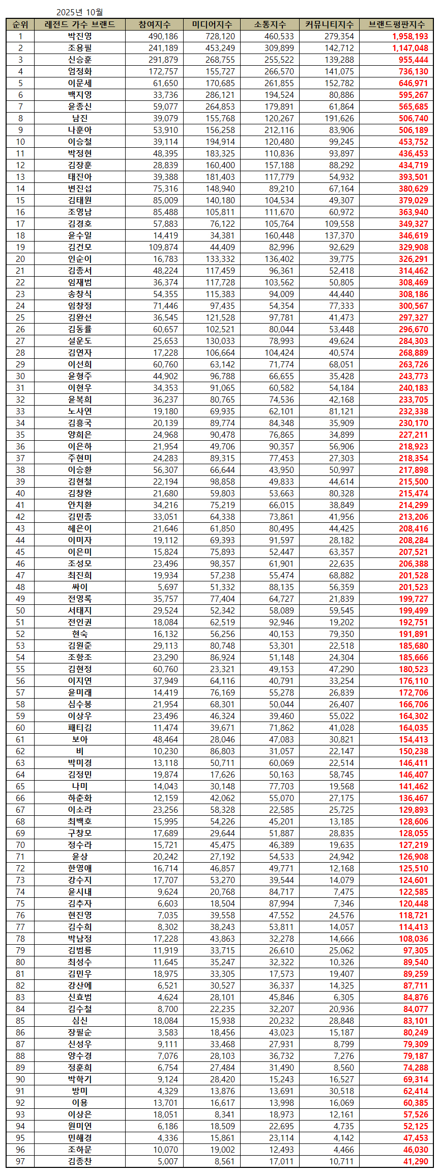 레전드 가수 브랜드평판 2025년 10월
