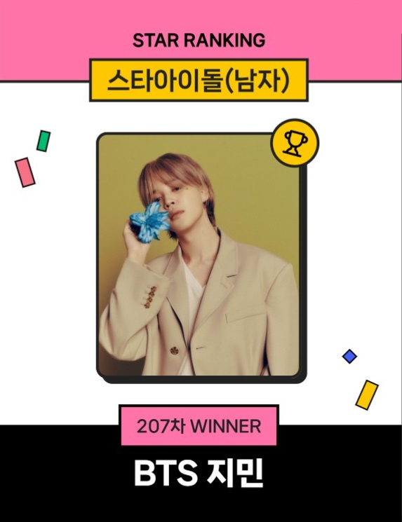 지민은 지난 9일 오후 3시 1분부터 16일 오후 3시까지 진행된 207차 스타랭킹 스타아이돌 남자 랭킹 투표에서 5만 618표로 1위를 차지했다. 그는 무려 207주 연속 정상을 지키며 놀라운 인기를 자랑했다.