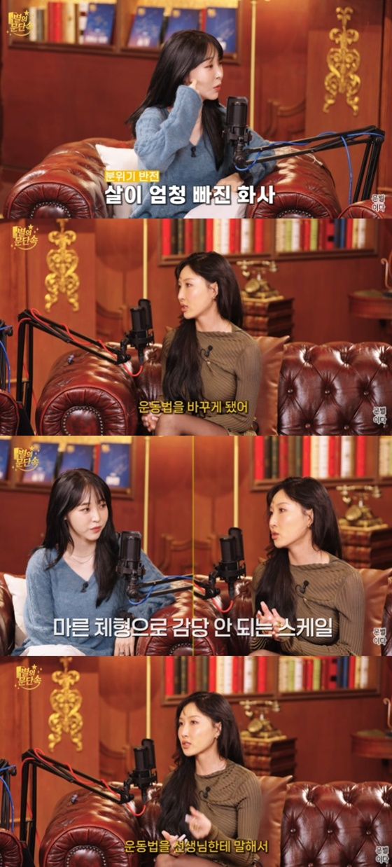 문별은 "근데 진짜 많이 뺐다. 사진으로 느껴지면 진짜 많이 뺀 거다"라고 감탄했다. 그러자 화사는 "그럼 끝난 거 아니냐"고 뿌듯해했다.