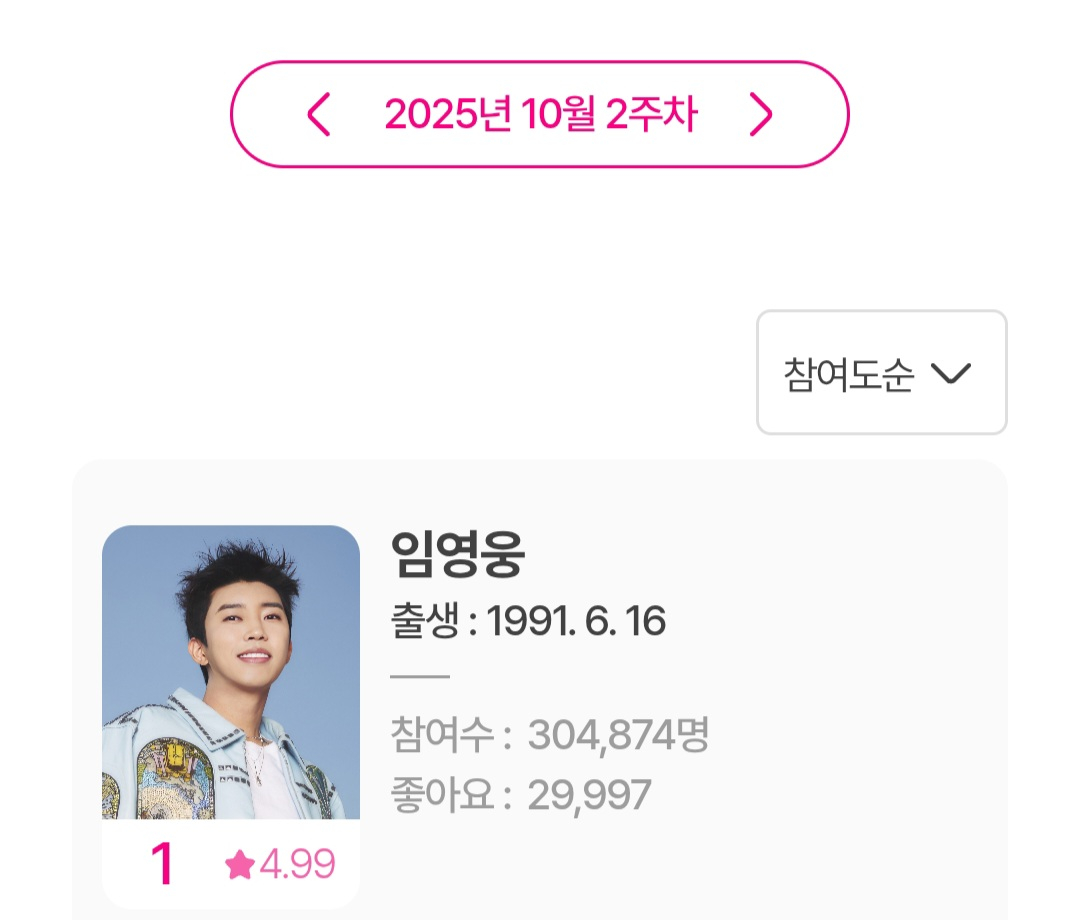 임영웅은 10월 13일부터 10월 19일까지 집계된 10월 2주차 아이돌차트 평점랭킹에서 30만 4874표를 획득, 1위를 차지했다.