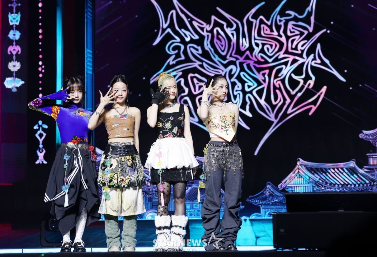 그룹 비비업이 22일 서울 용산구 블루스퀘어에서 진행된 첫 번째 미니앨범 선공개 곡 'House Party' 발매 기념 쇼케이스에서 포즈를 취하고 있다. /2025.10.22 /사진=김휘선 hwijpg@
