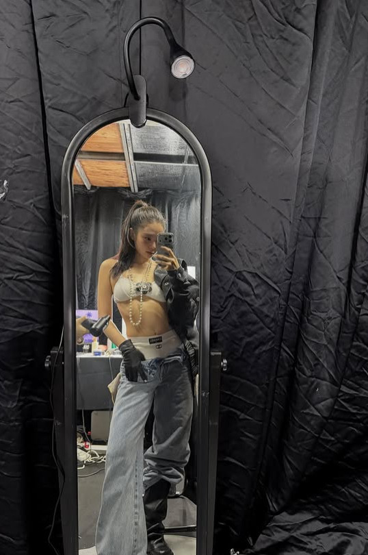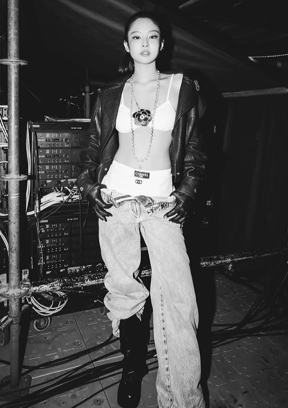 공개된 사진 속엔 제니가 무대를 앞두고 포즈를 취한 모습이다. 그는 명품 브랜드 샤넬의 속옷을 착용하고 힙한 분위기를 풍긴다. 특히 브래지어에는 샤넬의 꽃이 달려 있어 이목을 끈다.
