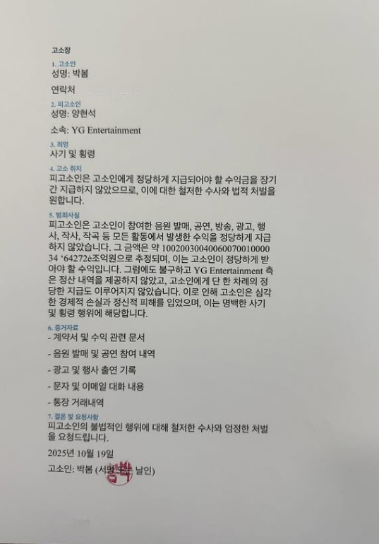 앞서 박봄은 지난 22일 개인 SNS에 YG의 수장 양현석이 2NE1 활동으로 발생한 수익금을 장기간 지급하지 않았다고 주장하며 고소장을 공개했다. 실제로 해당 사진에 따르면, 박봄은 피고소인으로 YG 양현석을 지목, 죄명을 "사기 및 횡령"이라고 표기했다. 고소 취지에 대해서는 "피고소인은 고소인에게 정당하게 지급돼야 할 수익금을 장기간 지급하지 않았으므로, 이에 대한 철저한 수사와 법적 처벌을 원한다"라고 이야기했다.