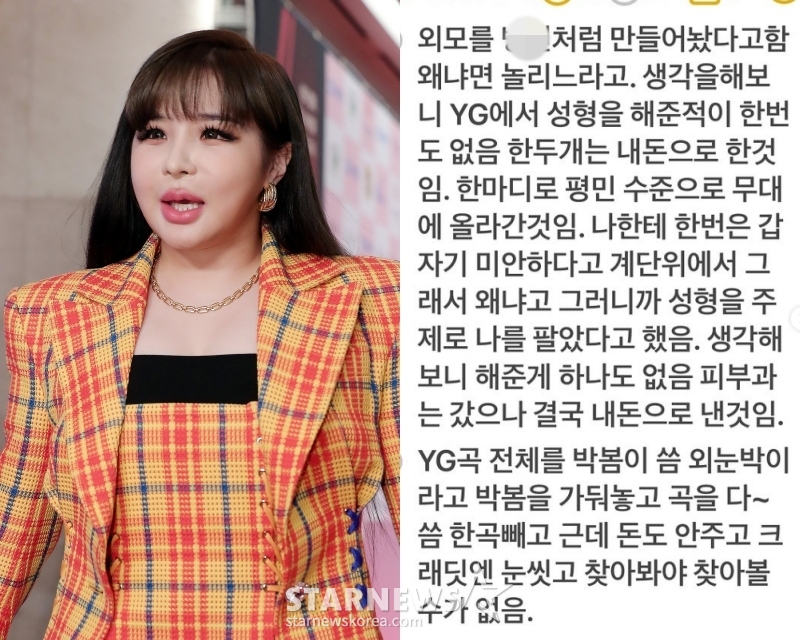 박봄은 "외모를 병X처럼 만들어놨다고 함. 왜냐면 놀리느라고. 생각을 해보니 YG에서 성형을 해준 적이 한 번도 없음. 한 두개는 내 돈으로 한 것임. 한 마디로 평민 수준으로 무대에 올라간 것임"이라고 불만을 드러냈다.