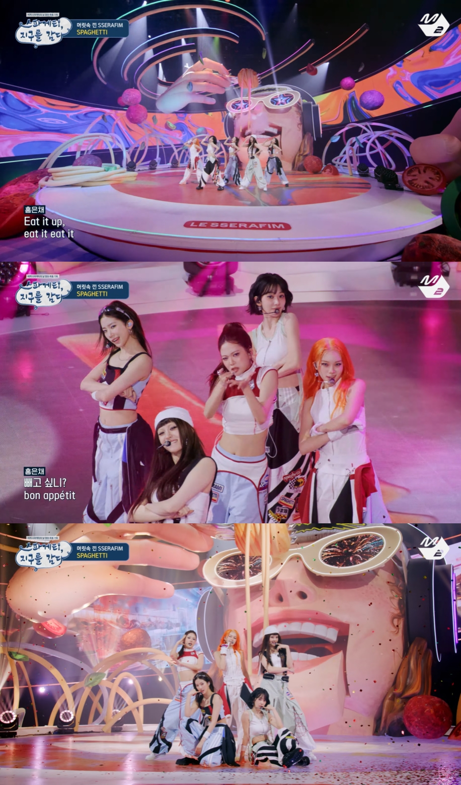 컴백 프로그램의 '킥'은 타이틀곡 'SPAGHETTI (feat. j-hope of BTS)' 무대였다. 이 곡은 머릿속에서 자꾸 맴돌고 생각나는 르세라핌을 이에 낀 스파게티에 비유한 노래다. "씹고 뜯고 맛보고 즐기다 가면 돼", "내 김치 포즈는 여전히 priceless" 같이 요리와 연계된 독특한 가사가 '듣는 맛'을 선사한다.