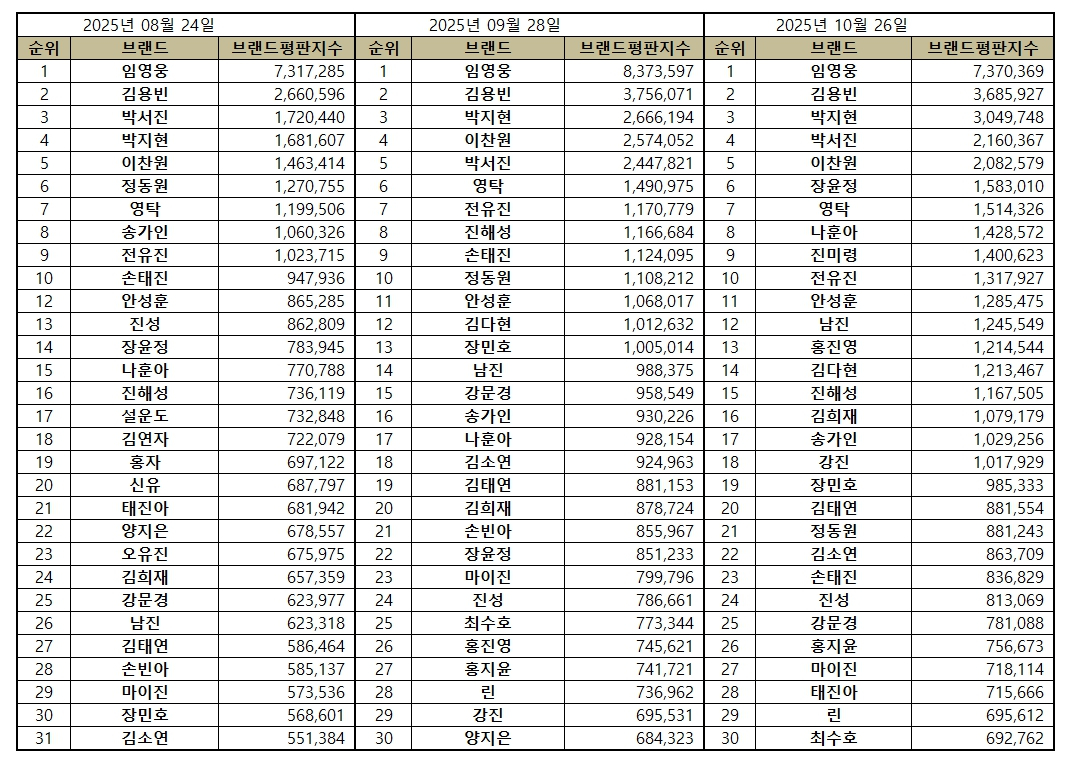 2025년 10월 트로트 가수 브랜드평판 30위 순위는 임영웅, 김용빈, 박지현, 박서진, 이찬원, 장윤정, 영탁, 나훈아, 진미령, 전유진, 안성훈, 남진, 홍진영, 김다현, 진해성, 김희재, 송가인, 강진, 장민호, 김태연, 정동원, 김소연, 손태진, 진성, 강문경, 홍지윤, 마이진, 태진아, 린, 최수호 순으로 분석됐다.
