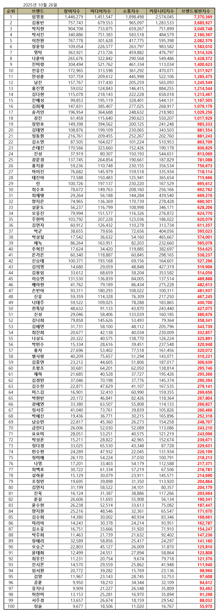 임영웅은 10월 26일 한국기업평판연구소가 발표한 트로트 가수 브랜드평판 2025년 10월 빅데이터 분석결과, 1위를 차지했다. 1위 임영웅에 이어 2위 김용빈, 3위 박지현 순이었다.