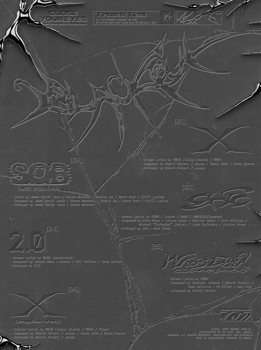 '블랙아웃'에는 '시크(CHIC)', '2.0', '후스 댓?(Who's Dat?) (Jane Doe)', 그리고 타이틀곡 중 하나인 'X'의 영어 버전까지, 클로즈 유어 아이즈의 폭넓은 음악 스펙트럼을 증명할 총 6곡이 알차게 수록된다.