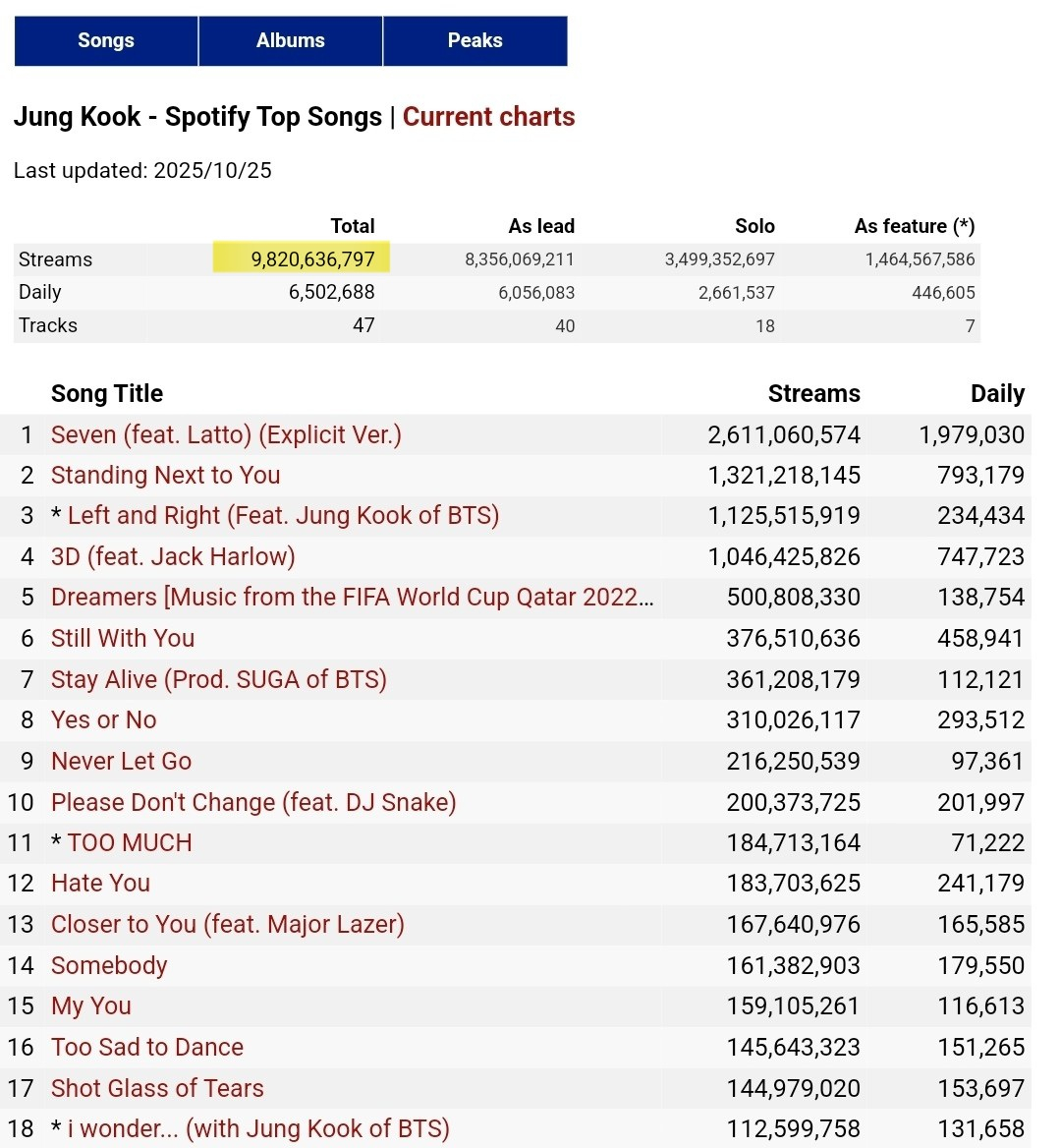 정국의 스포티파이 계정에서 가장 높은 스트리밍을 나타내고 있는 솔로 싱글 'Seven'(세븐)은 26억 스트리밍을 기록하며 역대 아시아 가수곡 '최초', '최단' 신기록을 이어가고 있다.