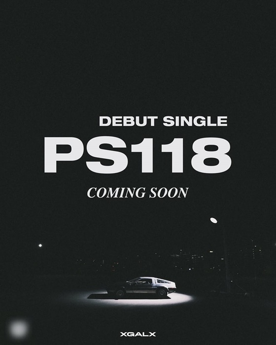흑백 이미지에는 어두운 밤 한 대의 차량이 스포트라이트를 받고 있으며, 상단에는 'DEBUT SINGLE PS118 COMING SOON'(데뷔 싱글 PS118 커밍 순)이라는 문구가 포함돼 있다.